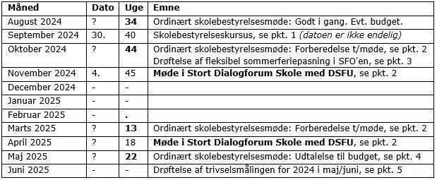 Det foreslås at planlægge et skolebestyrelsesmøde ca. uge 22/2025, med forbehold for den kommende tidsplan.